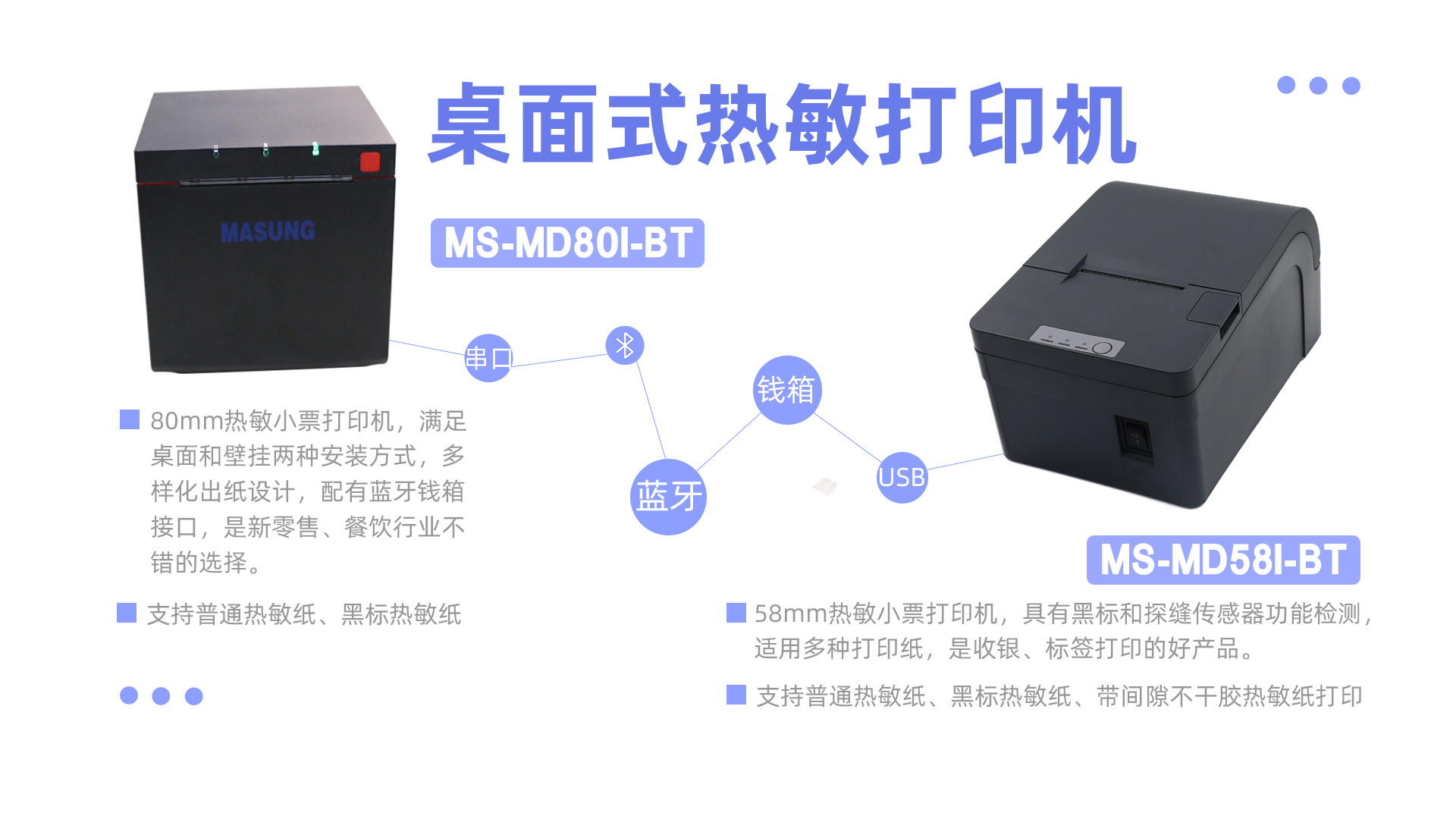 這兩款新發(fā)布的桌面小票打印機,一款是80mm熱敏小票打印機,滿足桌面和壁掛兩種安裝方式,多樣化出紙設計,配有藍牙錢箱接口,是新零售、餐飲行業(yè)不錯的選擇。另一款是58mm熱敏小票打印機,具有黑標和探縫傳感器功能檢測,適用多種打印紙(普通熱敏紙,黑標熱敏紙,帶間隙不干膠標簽熱敏紙),是收銀、標簽打印的好產(chǎn)品。