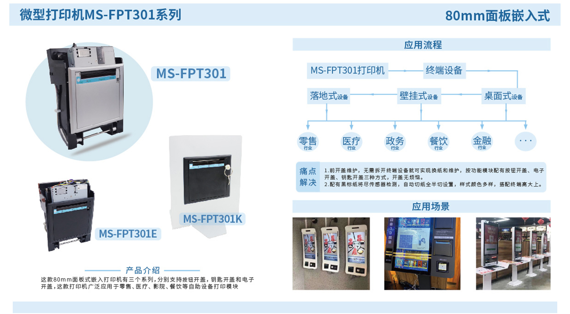 美松MASUNG微型打印機廣泛應用在落地式、壁掛式、桌面式自助終端設備上,實現(xiàn)打印票據(jù)功能的模塊。在金融行業(yè),微型打印機可嵌入ATM機、自助繳費機、自助存取款機提供打印需求;在醫(yī)療服務行業(yè),微型打印機嵌入自助掛號繳費機、自助取單查詢機提供打印模塊;在消費零售行業(yè),微型打印機為自助售貨機、自助加油機、自助點餐機、自助取票機,新零售自助結(jié)算機等自助設備提供排號打印的功能;在公共服務行業(yè),微型打印機適配AFC系統(tǒng),自助圖書館服務機、自助稅務機等終端設備,提供打印模塊。