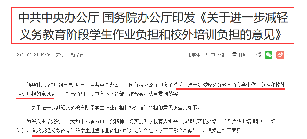 教育是百年大計,為管理校外培訓(xùn)不斷標(biāo)準(zhǔn)規(guī)范化,近期,中共中央辦公廳、國務(wù)院下發(fā)了有關(guān)于進(jìn)一步減少九年義務(wù)基礎(chǔ)教育階段的《意見》和“雙減”(如下圖),引起社會的諸多觀注。