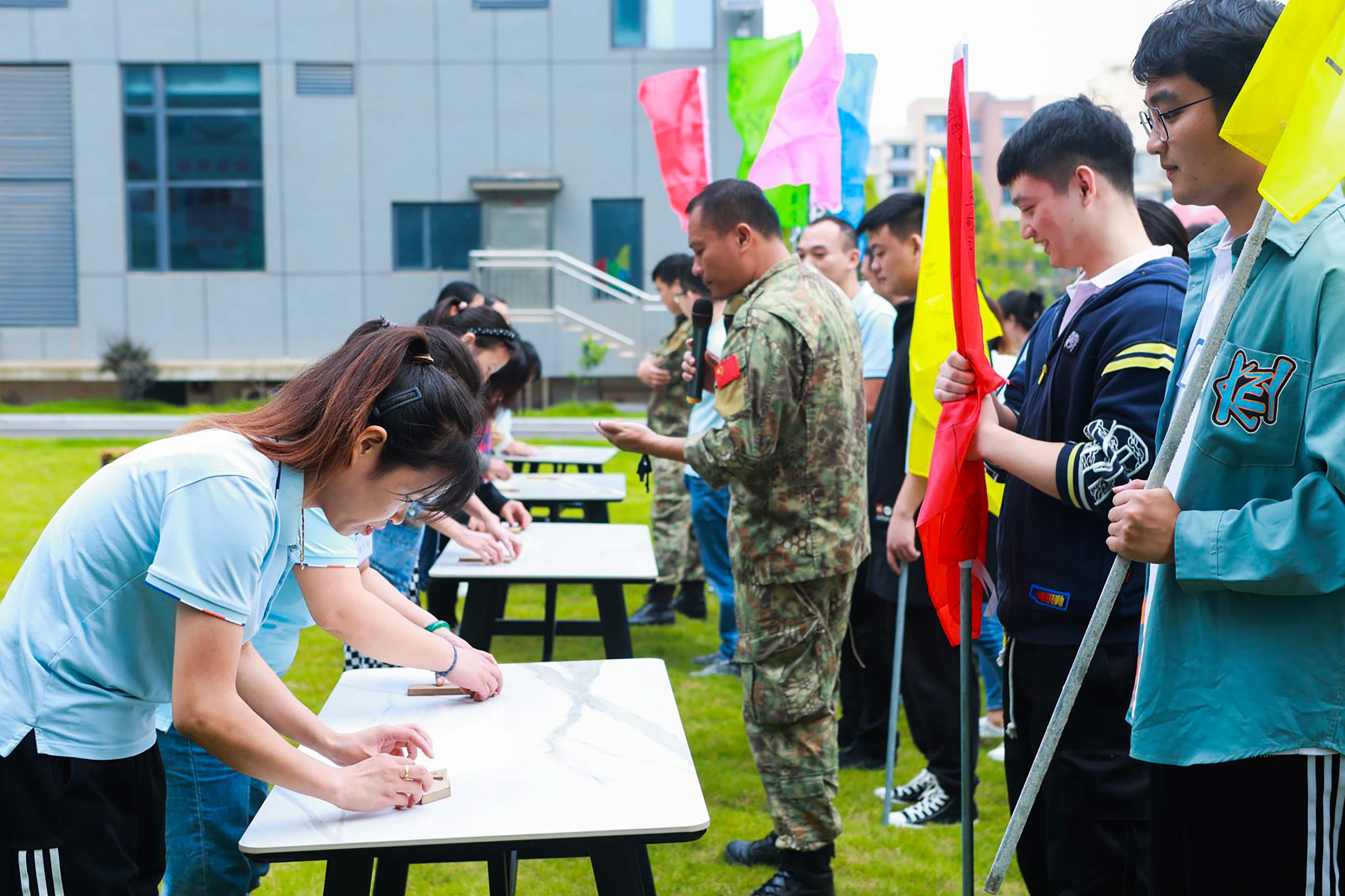 一聲哨響,全體長(zhǎng)沙美松人于7:50準(zhǔn)時(shí)在園區(qū)草坪內(nèi)集合,在美松信息總經(jīng)理黃尤川先生的開(kāi)場(chǎng)講話中拉開(kāi)了本次特訓(xùn)營(yíng)活動(dòng)的帷幕,一張張笑臉在初秋的陽(yáng)光照射下顯得格外美麗與帥氣。生活需要儀式感,工作需要?dú)w屬感,在4名專業(yè)的教練組織安排下,快速組成16支隊(duì)伍。集眾人智慧,濃縮創(chuàng)新意識(shí),在各隊(duì)長(zhǎng)的帶領(lǐng)下分別給自己的戰(zhàn)隊(duì)制定隊(duì)名、設(shè)計(jì)隊(duì)徽、確定口號(hào)、排練隊(duì)形、自我介紹,員工們迅速打開(kāi)心扉并了解自己的同伴,隊(duì)旗一飄,無(wú)盡風(fēng)采,個(gè)個(gè)都神采奕奕!瞧!我們的麒麟隊(duì),口號(hào)一響,臨危受命,舍我其誰(shuí)?!