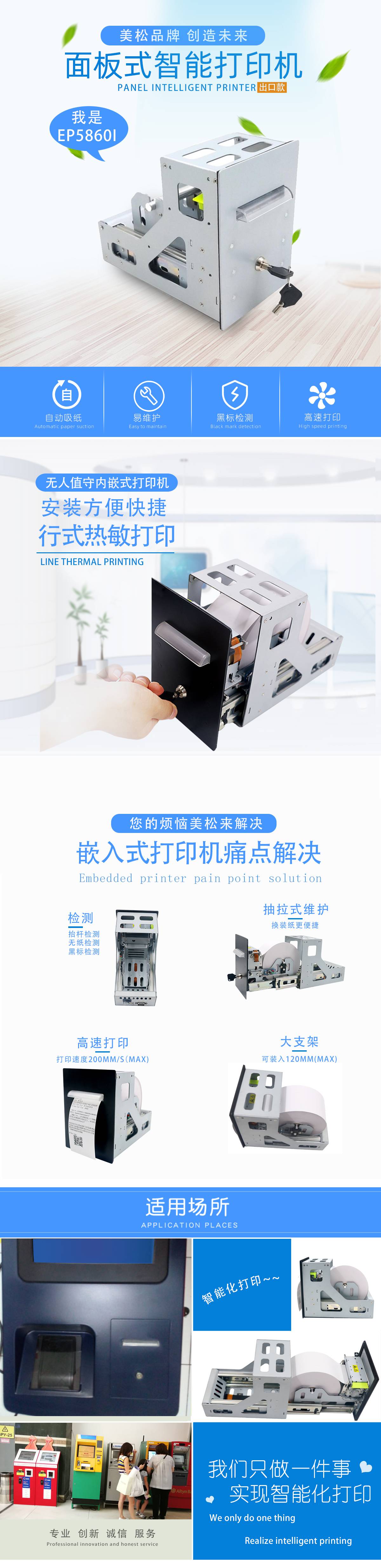 微型打印機介紹:與80mm微型熱敏打印機不同,這款是58MM的微型打印機,型號為EP5860I微型打印機是一款58mm嵌入式微型打印機,不同于其他58MM打印機,這款嵌入式微型打印機配有開關(guān)鎖鑰匙,放心應(yīng)用,只需要簡單安裝就能實現(xiàn)打印功能的打印模塊,嵌入在不同的終端設(shè)備,例如加油站、餐飲收銀機、排隊繳費機等,微型熱敏打印機是儀器儀表,超級市場,便利店,郵政,銀行,煙草專賣,公用事業(yè)抄表,移動警務(wù)系統(tǒng),移動政務(wù)系等行業(yè)的自助終端打印設(shè)備。