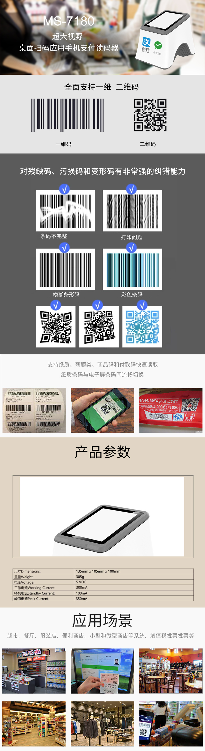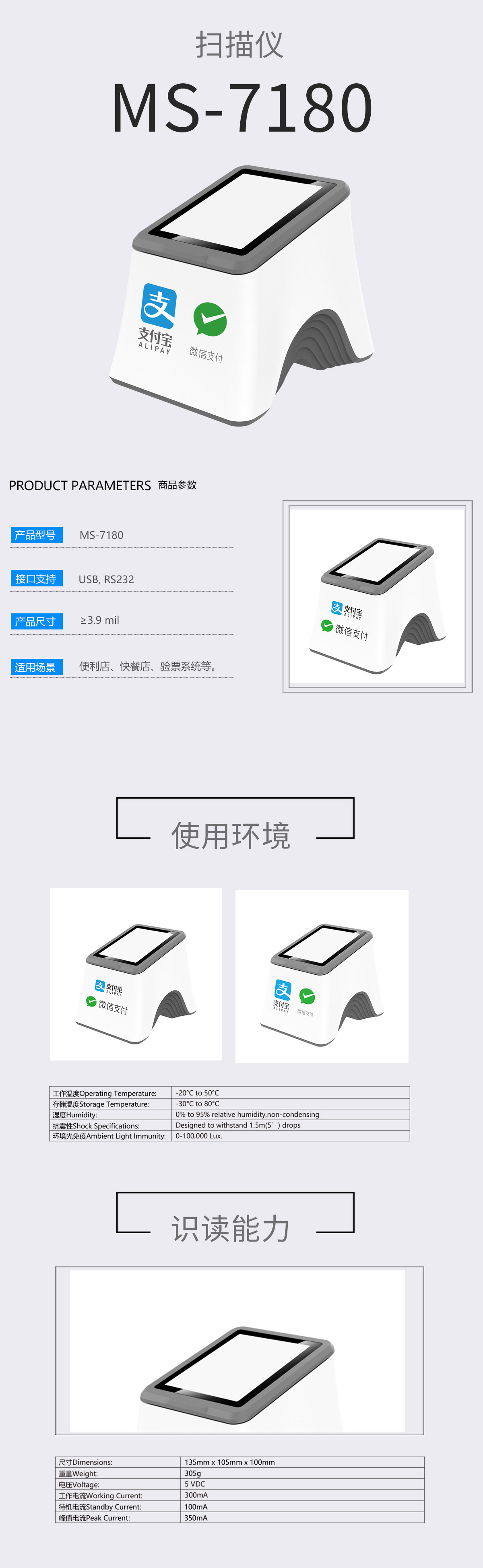 美松二維碼掃描模塊MS-7180掃描二維碼收款,條碼掃描收款,大窗口模式,支持貼屏掃碼,無(wú)需對(duì)準(zhǔn);支持微信,支付寶,美團(tuán)等掃碼支付;掃碼成功語(yǔ)音播報(bào) ,解放收銀員,更避免漏單;接口豐富,內(nèi)置RS232 和USB接口;經(jīng)典外觀設(shè)計(jì),視場(chǎng)40.5°(H)x31°(V),運(yùn)動(dòng)容差>2m/s,接口支持USB, RS232,掃碼槍二維碼支付盒子,掃描平臺(tái),超市收銀,醫(yī)院藥店電子醫(yī)保卡,社???健康碼掃描器掃碼墩小白盒,手機(jī)支付/電子醫(yī)保卡/健康碼.