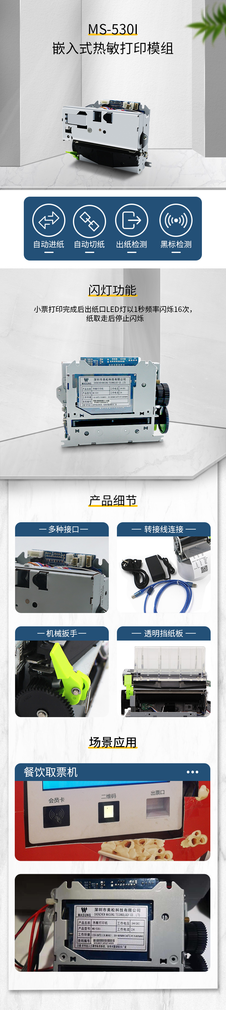MS-530I 打印機是一種新型行式熱敏打印機,擁有自動進紙、自動切紙、黑 標檢測等功能,另可增加防堵紙、閃燈、紙將盡、出紙檢測、吐紙器等功能。支持多種條形碼的打印,包括:EAN8、EAN13、CODE39、CODE128 等多種 一維條形碼的打印,同時支持 PDF417, QRCODE 等二維碼的打印。
