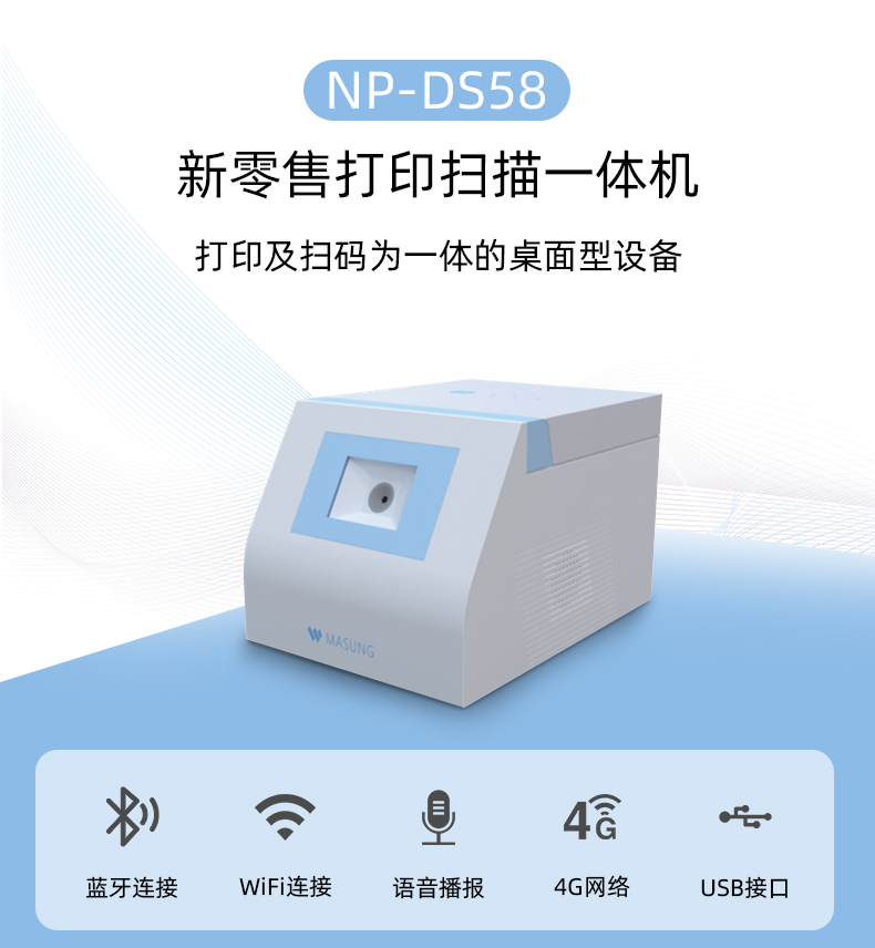 在新零售行業(yè)廣泛應用的打印掃描一體機NP-DS58,同時兼顧打印和掃描兩種功能的一體式設備,具有藍牙連接和wiff連接等連接方式,帶有4G網(wǎng)絡接口,和USB接口連接,收銀掃碼都十分方便,帶有語音播報功能,更方便收銀結(jié)賬。