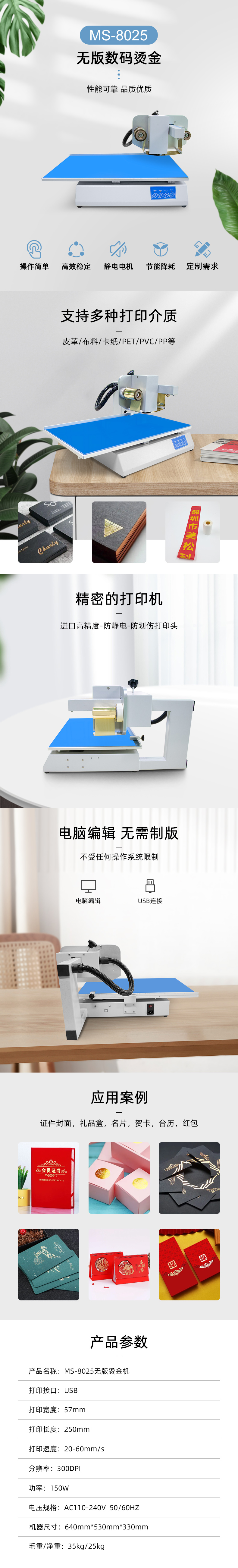 美松無版數(shù)碼燙金機(jī)MS-8025采用日本原裝rohm打印頭,最新設(shè)計(jì)徹底取代傳統(tǒng)的燙金機(jī)。身材小巧、節(jié)約空間重量、方便移動(dòng);最大打印厚度可達(dá)30mm、用途廣泛。軟件控制、可加工復(fù)雜圖案文字照片等,可在不光滑的卡紙、皮革上燙印各種圖案文字。用戶無需制版、開模,功率低,經(jīng)濟(jì)快捷,簡(jiǎn)單操作,一看即懂,輕松自如。