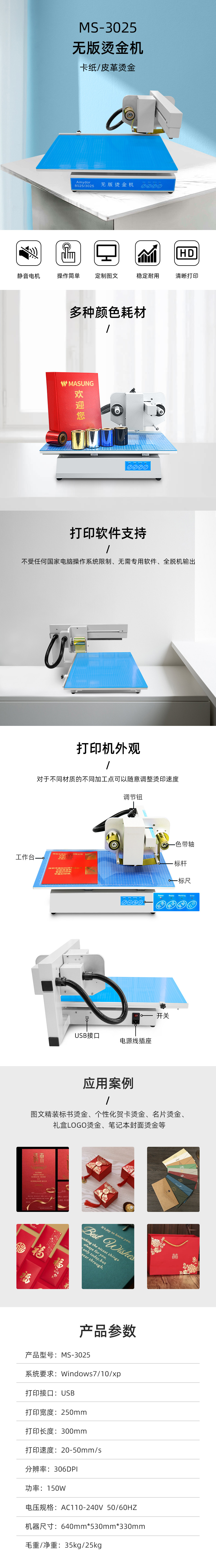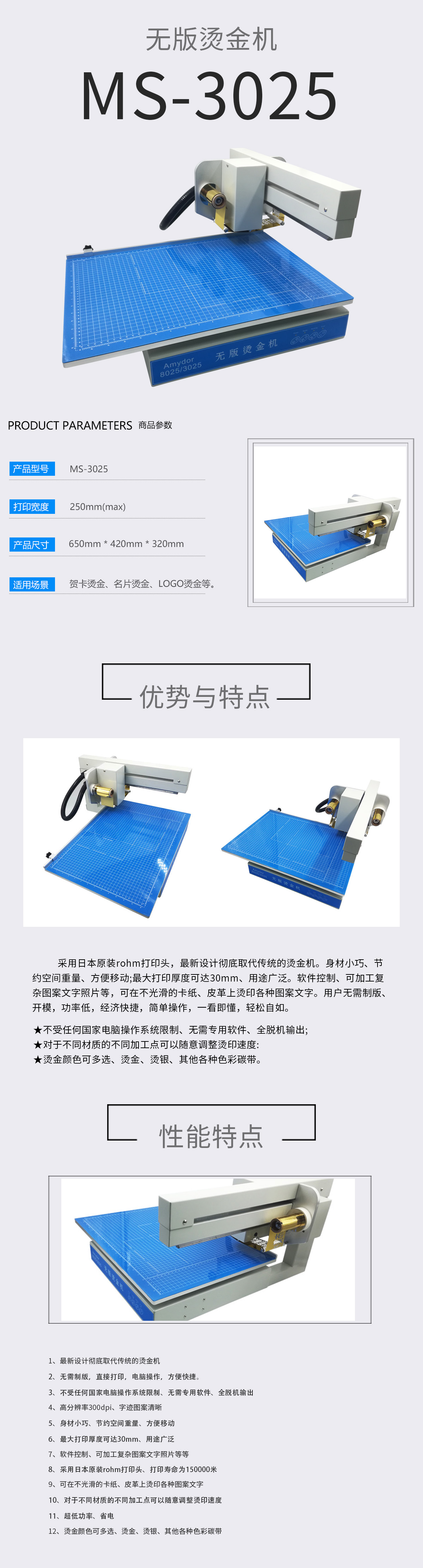 美松無版數(shù)碼燙金機(jī)MS-8025,MS-3025采用日本原裝rohm打印頭,最新設(shè)計(jì)徹底取代傳統(tǒng)的燙金機(jī)。身材小巧、節(jié)約空間重量、方便移動;最大打印厚度可達(dá)30mm、用途廣泛。軟件控制、可加工復(fù)雜圖案文字照片等,可在不光滑的卡紙、皮革上燙印各種圖案文字。用戶無需制版、開模,功率低,經(jīng)濟(jì)快捷,簡單操作,一看即懂,輕松自如。
