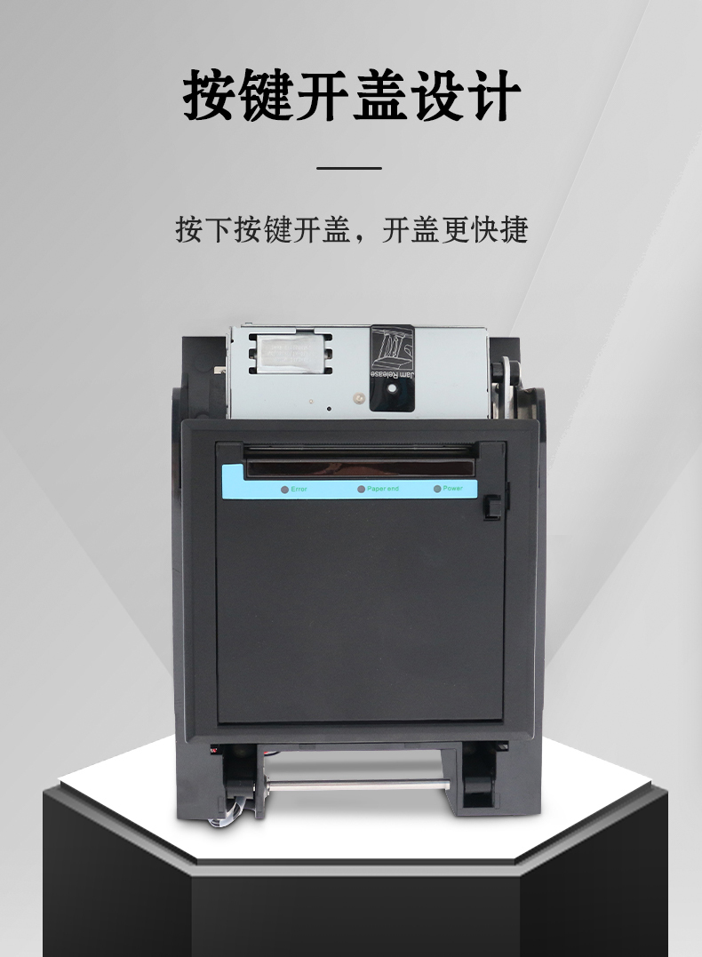 1.超薄機(jī)身設(shè)計,專用于高度集成的終端服務(wù)設(shè)備 2.紙倉最大化設(shè)計,80*80大紙卷,避免頻繁換紙 3.開蓋方式多樣化:按鍵,鑰匙和電子鎖開蓋 4.前維護(hù)式,不需要打開機(jī)柜換紙 5.分為有邊框和無邊框,無邊框更易嵌入在終端服務(wù)設(shè)備