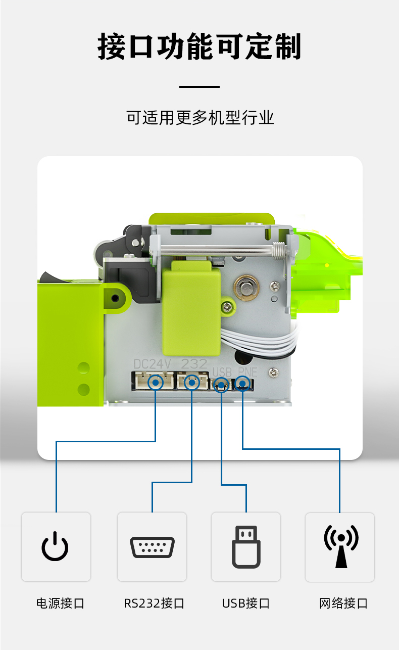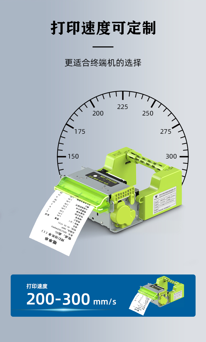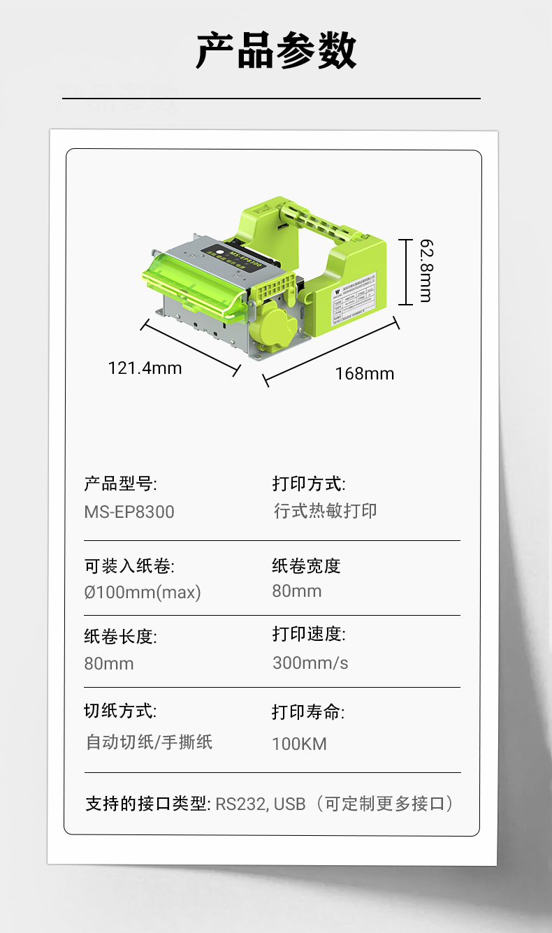 MS-EP8300作為由美松最新自主研發(fā)的高速熱敏票據(jù)自助打印機(jī),采用了最新的“清新綠”配色,在外觀上具有獨(dú)特的配色美感,,打印速度最高可達(dá)到300mm/s,是一款超高速的打印機(jī),具有多種接口類型可供選擇,RS232接口和USB接口,在操作上還具有多個(gè)提示燈和發(fā)光出紙嘴可選,,