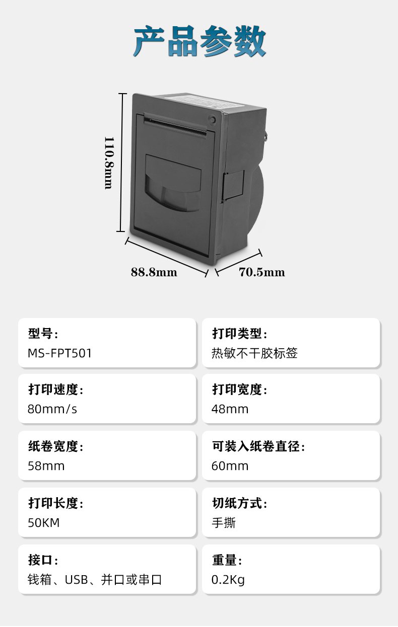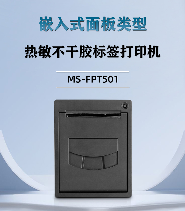 由美松研發(fā)的新型面板式熱敏不干膠標簽打印機,具有面板式打印機的易裝紙?zhí)攸c,能輕松的嵌入到各種自助設備中,同時可快速的進行維護換紙,MS-FPT501可打印的不干膠標簽在58mm左右,同時可選擇多種接口,比如錢箱、USB、并口或串口(二選一),作為一款熱敏不干膠標簽打印機,MS-FPT501可廣泛應用于商超零售標簽,醫(yī)療標簽,稱重價格標簽等多種行業(yè)標簽。