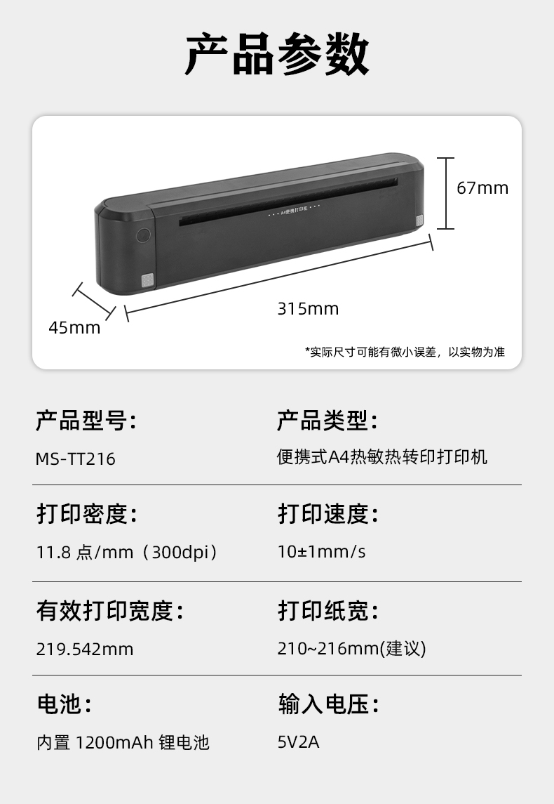 MS-TT216是美松的一款A(yù)4便攜式打印機,它的體積小巧打印的文字圖像清晰明亮, 同時具有熱敏打印模式和熱轉(zhuǎn)印打印模式, 在使用熱敏打印模式時,無需其他的耗材,只需要A4熱敏紙就可以進行打印,方便快捷 使用熱轉(zhuǎn)印模式進行打印,加入碳帶進行打印,打印的文字圖像更清晰明亮,保存時間更長 在使用的耗材紙張方面,可支持多種類型的介質(zhì)打印 打印的介質(zhì)厚度 0.07-0.12mm左右即可完美打印