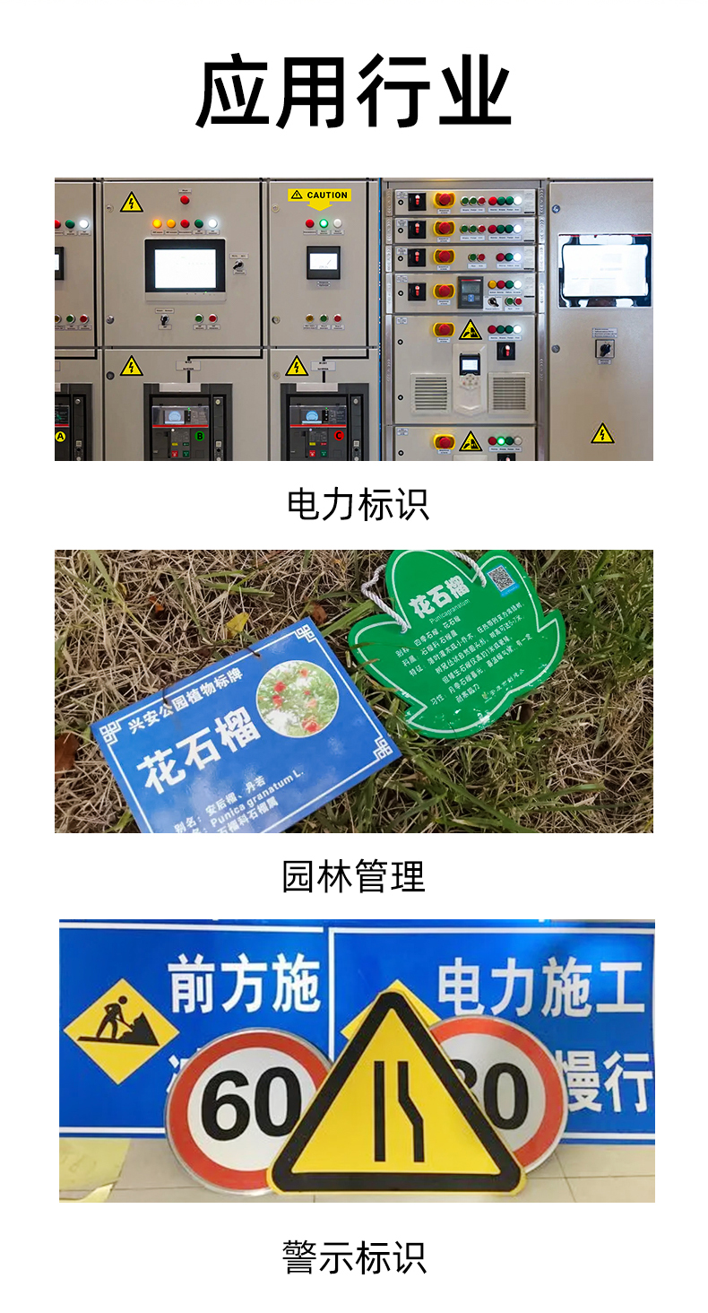 應用于多種行業(yè),比如電力標識標牌,施工危險警示標識標牌,園林管理標牌,樹木介紹標牌,道路標識標牌